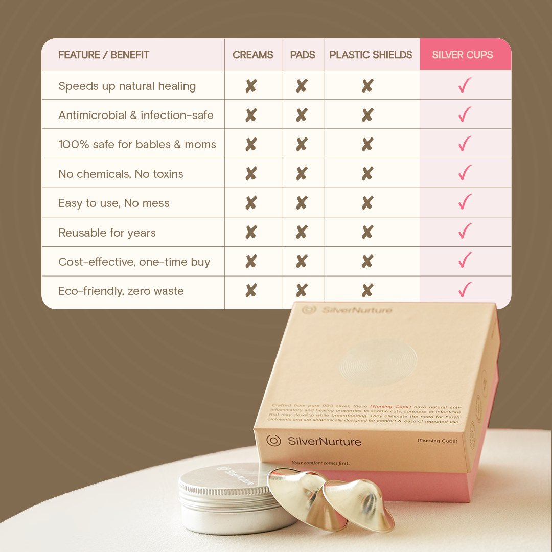 - Nursing cups are made entirely of pure 990 silver, caution should be taken while storing and handling them as pure silver is a soft material and can be dented if not stored safely
